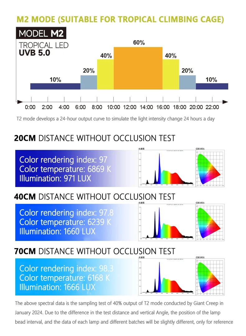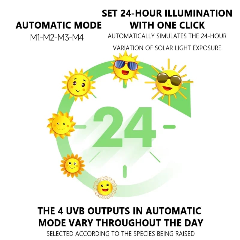The reptile UVB lamp has built-in UVB+UVA+6500K full-spectrum lighting function, which can simulate the day and night changes of natural light, provide an ideal lighting environment for reptiles, and help adjust the circadian biological clock.