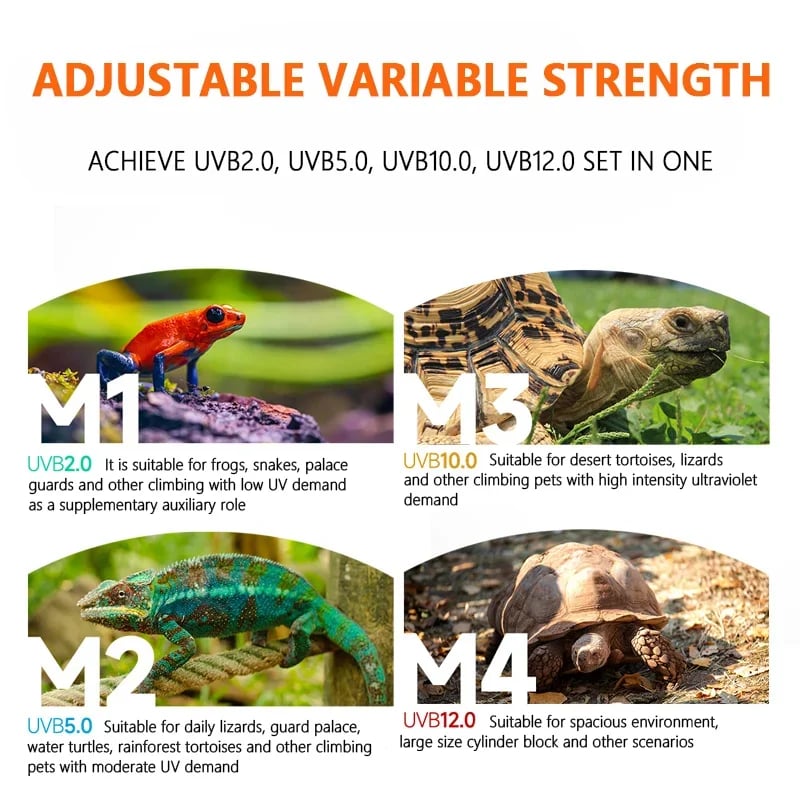 One lamp can be used for multiple purposes, easily achieving four intensity adjustments of UVB 2.0, UVB 5.0, UVB 10.0, and UVB 12.0 to meet the light needs of different types of reptiles.